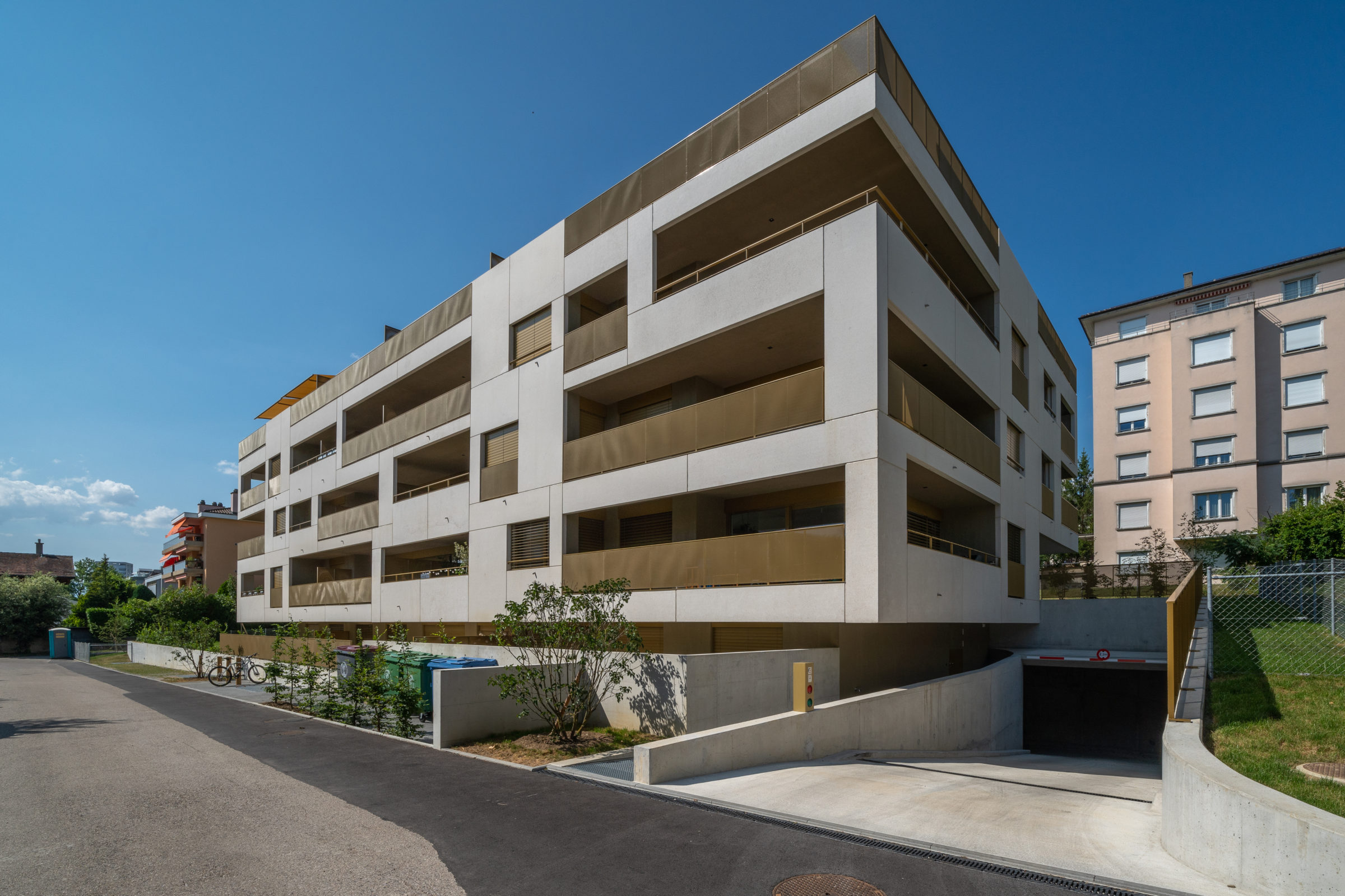 L’intégration dans la pente organise l’accès principal depuis l’avenue de Cour tandis que le pied de l’immeuble côté sud offre des logements avec jardins de plain-pied.