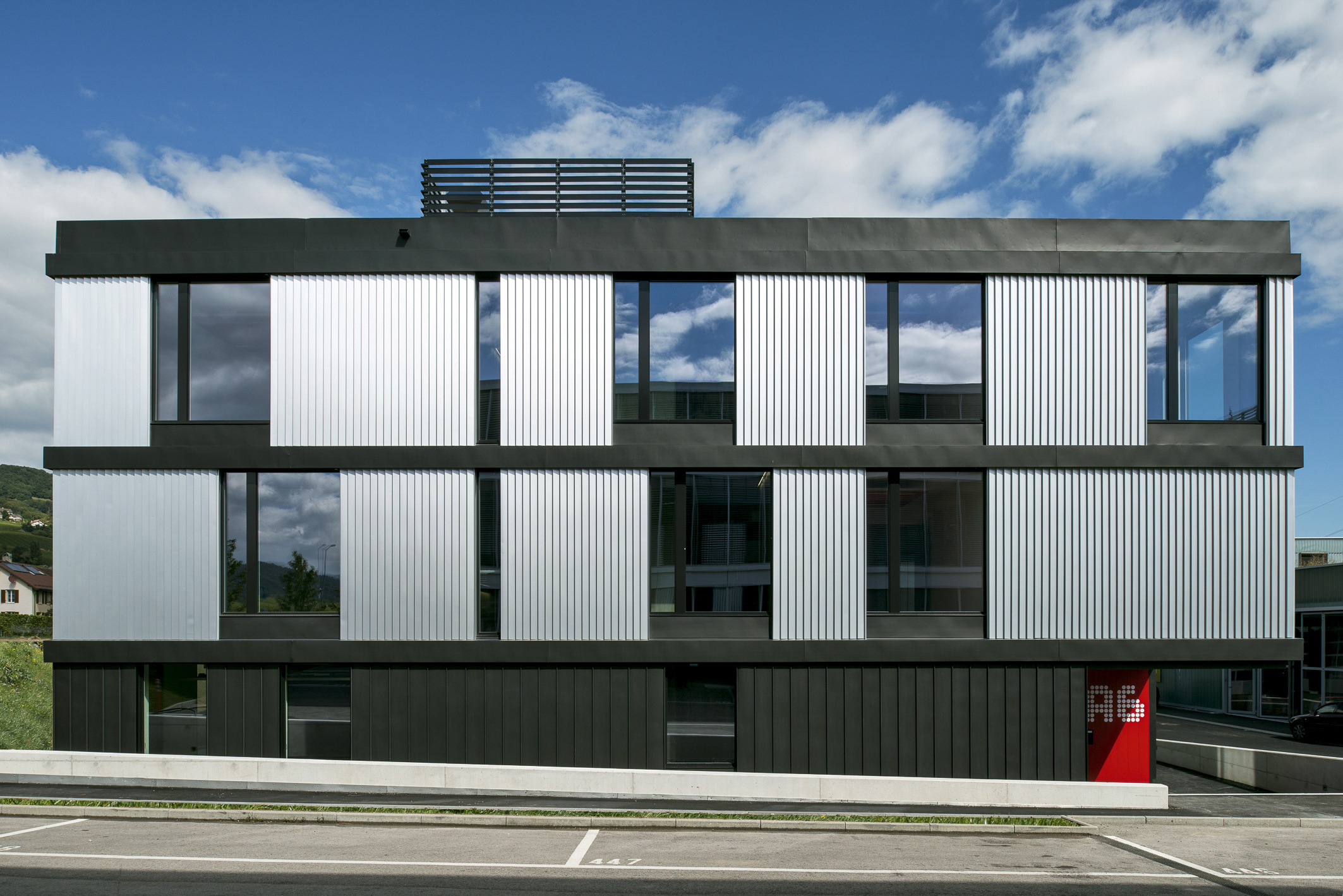 L’aspect architectural fait appel à un vitrage métallique thermolaqué anthracite. Les revêtements extérieurs sont en zinc à bardage agrafé, permettant de diminuer l’impact visuel du volume du garage. Les finitions en tôle profilée aluminium donnent une variation de l’aspect selon l’ensoleillement.