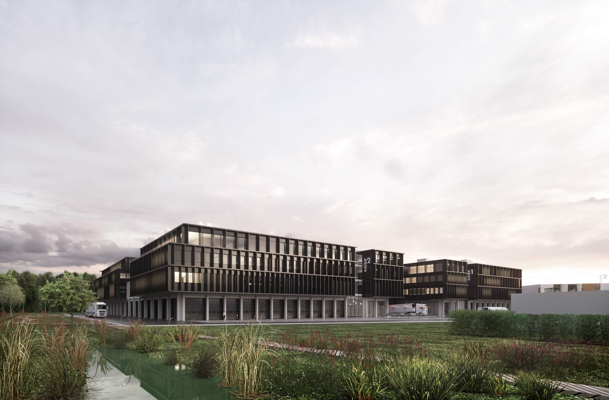 Le projet s’organise en plan par deux volumes principaux épousant les formes de la parcelle et ceinturé par une voie d’accès pour utilitaires.