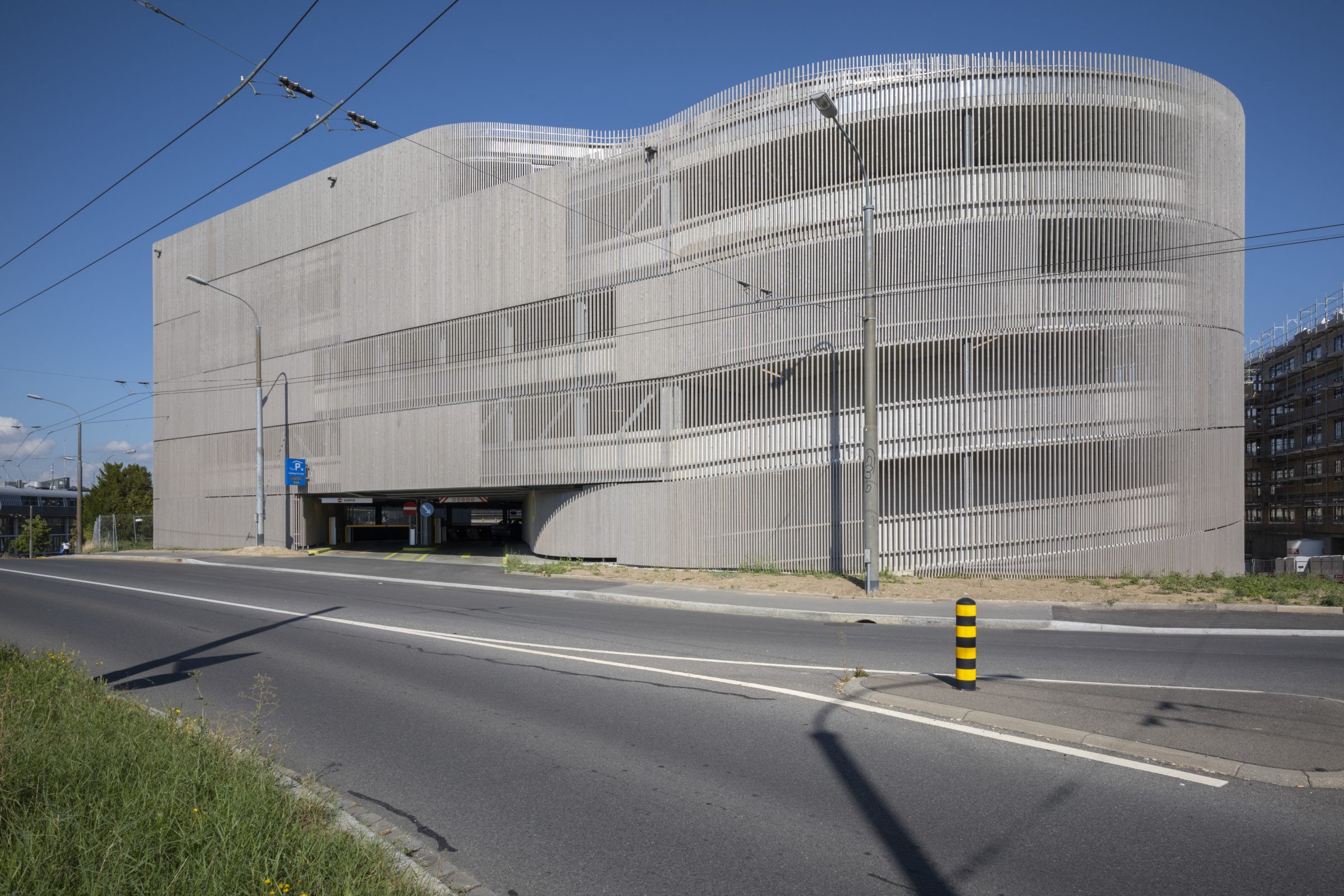 Le parking centralisé silo de 710 places se décompose en une série de 7 plateaux reliés par une rampe hélicoïdale à l’angle sud-ouest. La lecture de cette organisation spatiale se traduit en façade par la mise en valeur d’un ruban formé de lames verticales en bois qui se déroulent autour du bâtiment et du bas vers le haut. Par un jeu de lames, dont les interstices sont est variables, l’intérieur du bâtiment se dévoile par un effet de claire-voie.
